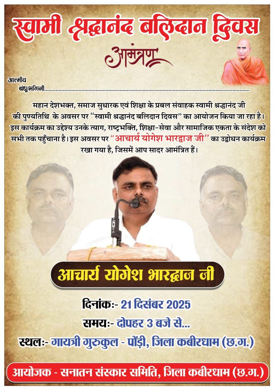 आचार्य योगेश भारद्वाज जी का प्रेरणादायी उद्बोधन आयोजित किया गया है, जिसमें आपकी गरिमामयी उपस्थिति सादर प्रार्थनीय है।