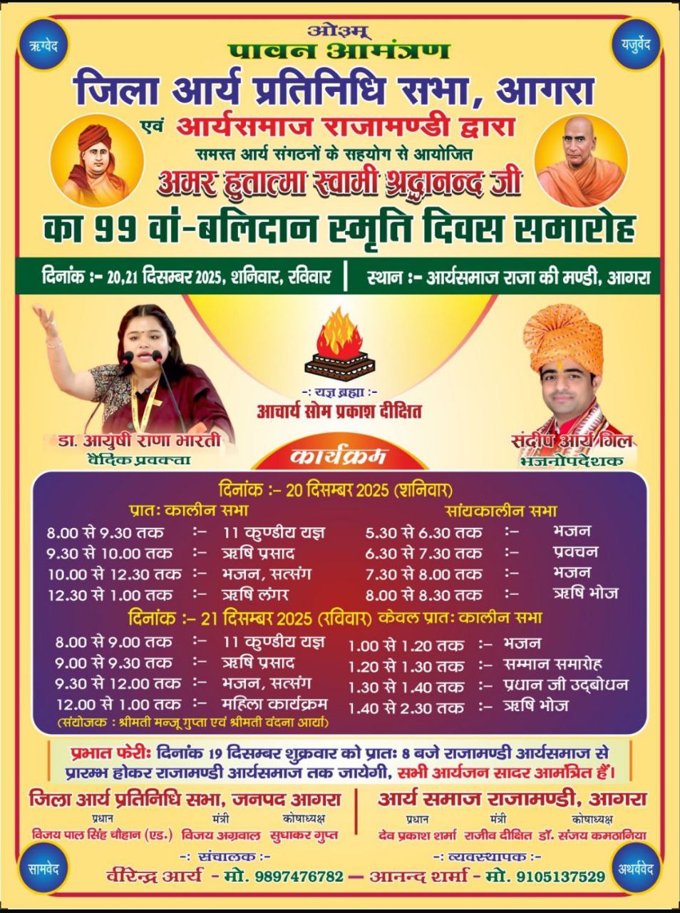 स्थान : आर्य समाज, राजा की मण्डी, आगरा