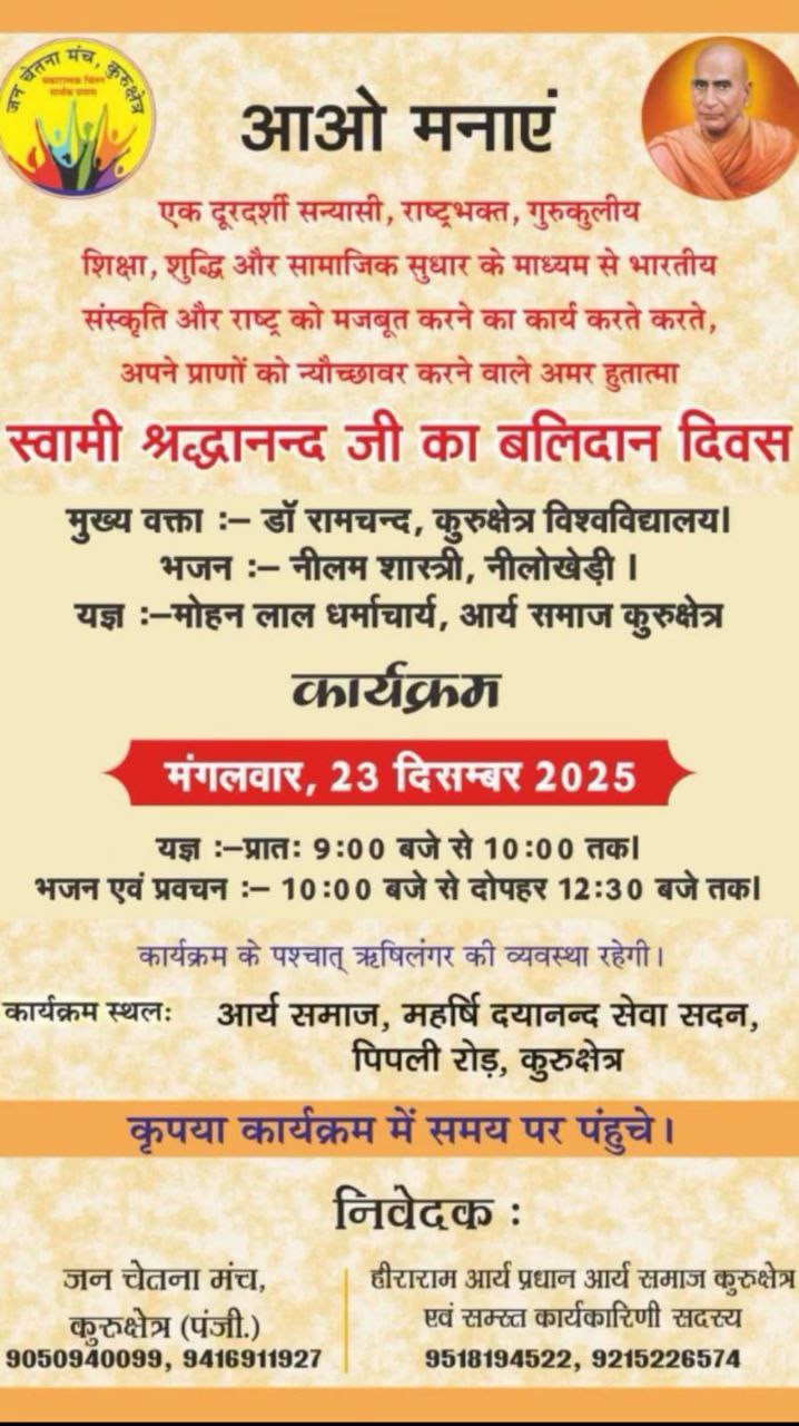 गुरुकुलीय शिक्षा, शुद्धि आन्दोलन और सामाजिक उत्थान के माध्यम से भारतीय संस्कृति एवं राष्ट्र को सुदृढ़ करते हुए अपने प्राणों को राष्ट्र हेतु न्यौछावर करने वाले अमर हुतात्मा स्वामी श्रद्धानन्द जी का बलिदान दिवस