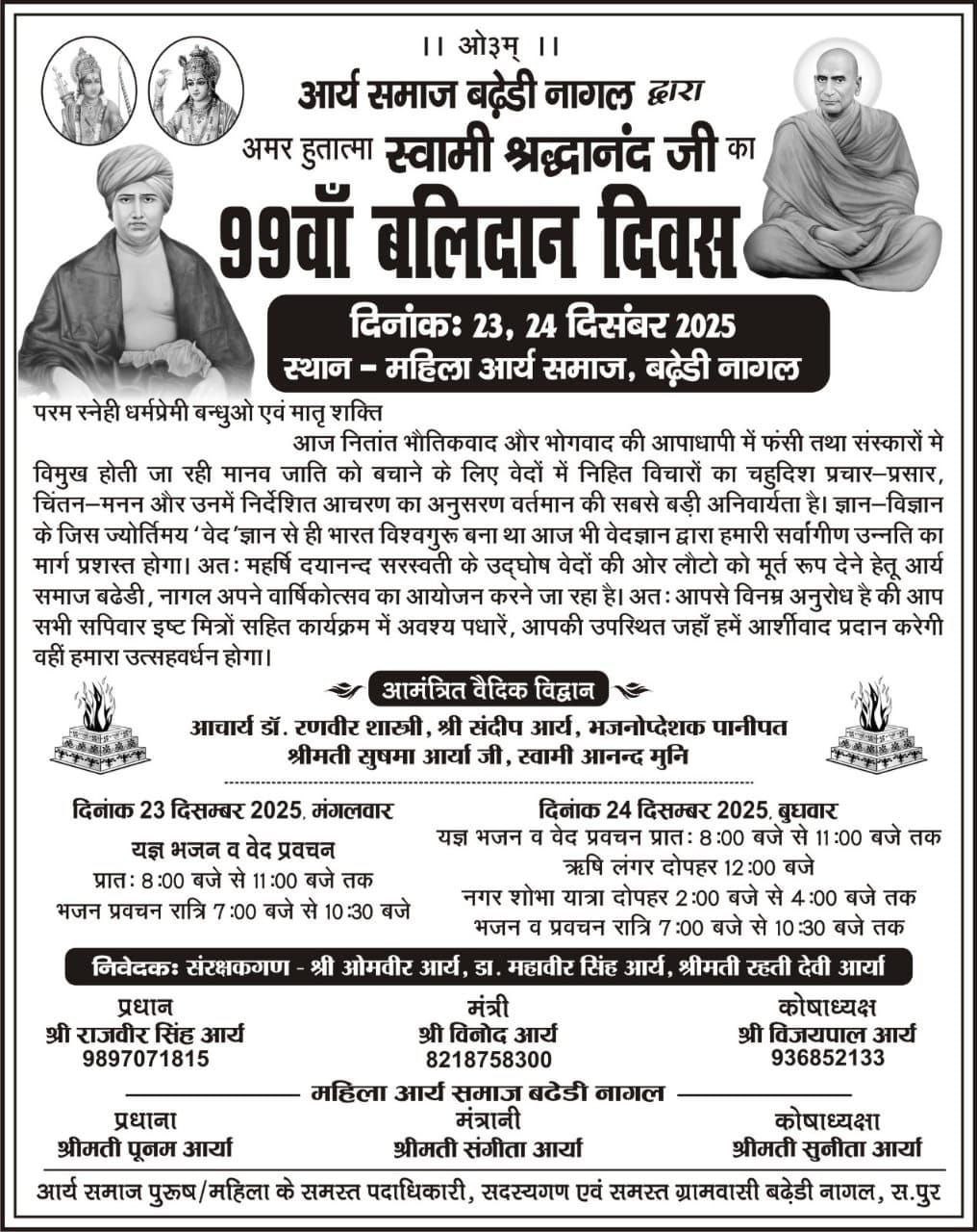 स्वामी श्रद्धानंद जी का 99वाँ बलिदान दिवस : आर्य समाज बढेड़ी नागल (सहारनपुर)