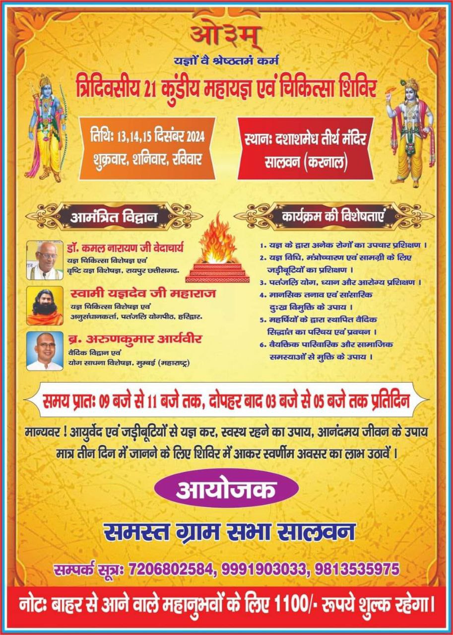 मान्यवर ! आयुर्वेद एवं जड़ीबूटियों से यज्ञ कर, स्वस्थ रहने का उपाय, आनंदमय जीवन के उपाय मात्र तीन दिन में जानने के लिए शिविर में आकर स्वर्णीम अवसर का लाभ उठावें ।