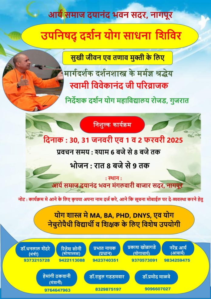 योग और उपनिषदों के गूढ़ रहस्यों को समझने तथा जीवन में आध्यात्मिक संतुलन स्थापित करने हेतु आर्य समाज दयानंद भवन, सदर, नागपुर में एक विशेष “उपनिषद् दर्शन योग साधना शिविर” का आयोजन किया जा रहा है। यह शिविर उन सभी साधकों, विद्यार्थियों और अध्यापकों के लिए उपयोगी रहेगा जो योग एवं दर्शन शास्त्र के माध्यम से तनाव मुक्त और सुखमय जीवन जीना चाहते हैं।