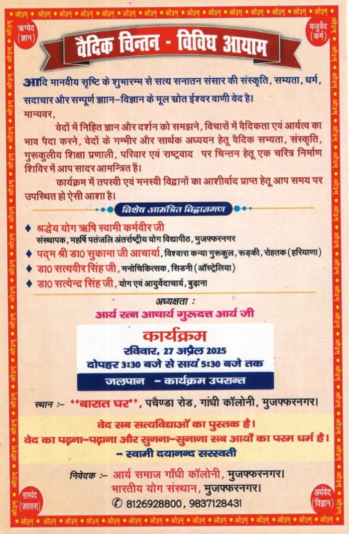 प्राचीन भारतीय संस्कृति और सभ्यता के मूल स्तम्भ वेद, केवल धार्मिक ग्रंथ नहीं, बल्कि सम्पूर्ण मानवता के लिए ज्ञान, विज्ञान, आचार, व्यवहार और आध्यात्मिकता के शाश्वत स्रोत हैं। वेदों की इस महत्ता को आत्मसात करने, उनके गूढ़ रहस्यों को समझने तथा जीवन में वैदिक मूल्यों को स्थापित करने के उद्देश्य से “वैदिक चिन्तन – विविध आयाम” नामक एक चरित्र निर्माण शिविर का आयोजन आर्य समाज गांधी कॉलोनी, मुजफ्फरनगर और भारतीय योग संस्थान के संयुक्त तत्वावधान में किया जा रहा है।