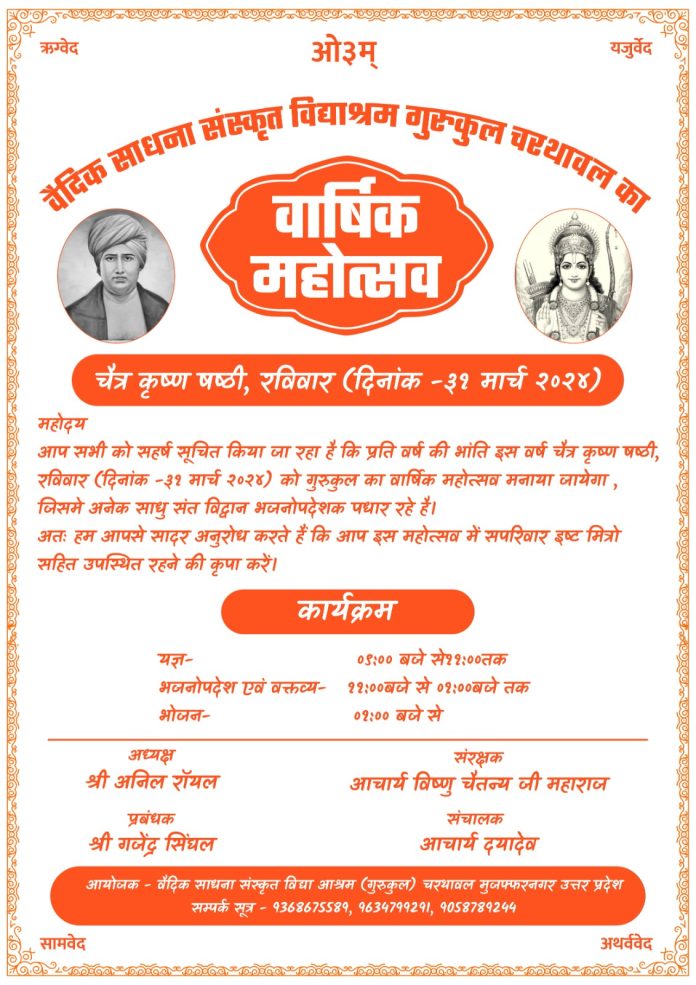 आप सभी को सहर्ष सूचित किया जा रहा है कि प्रति वर्ष की भांति इस वर्ष चैत्र कृष्ण षष्ठी, रविवार (दिनांक – ३१ मार्च २०२४) को गुरुकुल का वार्षिक महोत्सव मनाया जायेगा, जिसमे अनेक साधु संत विद्वान भजनोपदेशक पधार रहे है। अतः हम आपसे सादर अनुरोध करते हैं कि आप इस महोत्सव में सपरिवार इष्ट मित्रो सहित उपस्थित रहने की कृपा करें।