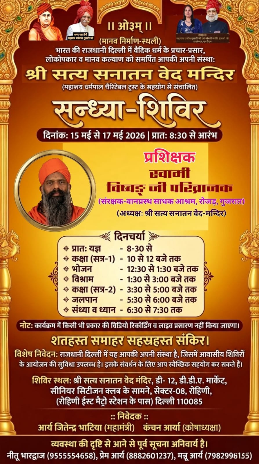 श्री सत्य सनातन वेद मंदिर, रोहिणी द्वारा वैदिक धर्म के प्रचार-प्रसार, लोकोपकार एवं मानव कल्याण की भावना को आगे बढ़ाते हुए 15 मई से 17 मई 2026 तक तीन दिवसीय संध्या-शिविर का आयोजन किया जा रहा है। यह शिविर वैदिक जीवन-पद्धति, यज्ञ, ध्यान, संध्या और आत्मिक उन्नति के उद्देश्य से आयोजित किया जा रहा है। इस आयोजन का मुख्य उद्देश्य समाज में वैदिक संस्कारों का जागरण करना तथा युवाओं और परिवारों को वैदिक ज्ञान से जोड़ना है।