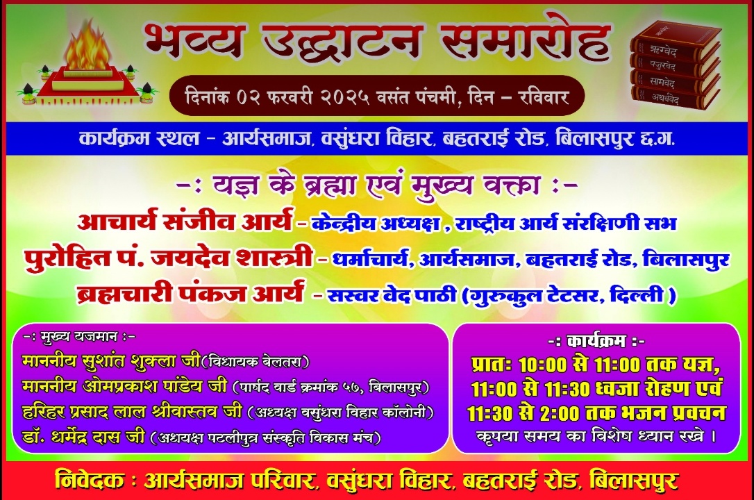 स्थान: आर्य समाज, वसुंधरा विहार, बहतराई रोड, बिलासपुर, छत्तीसगढ़