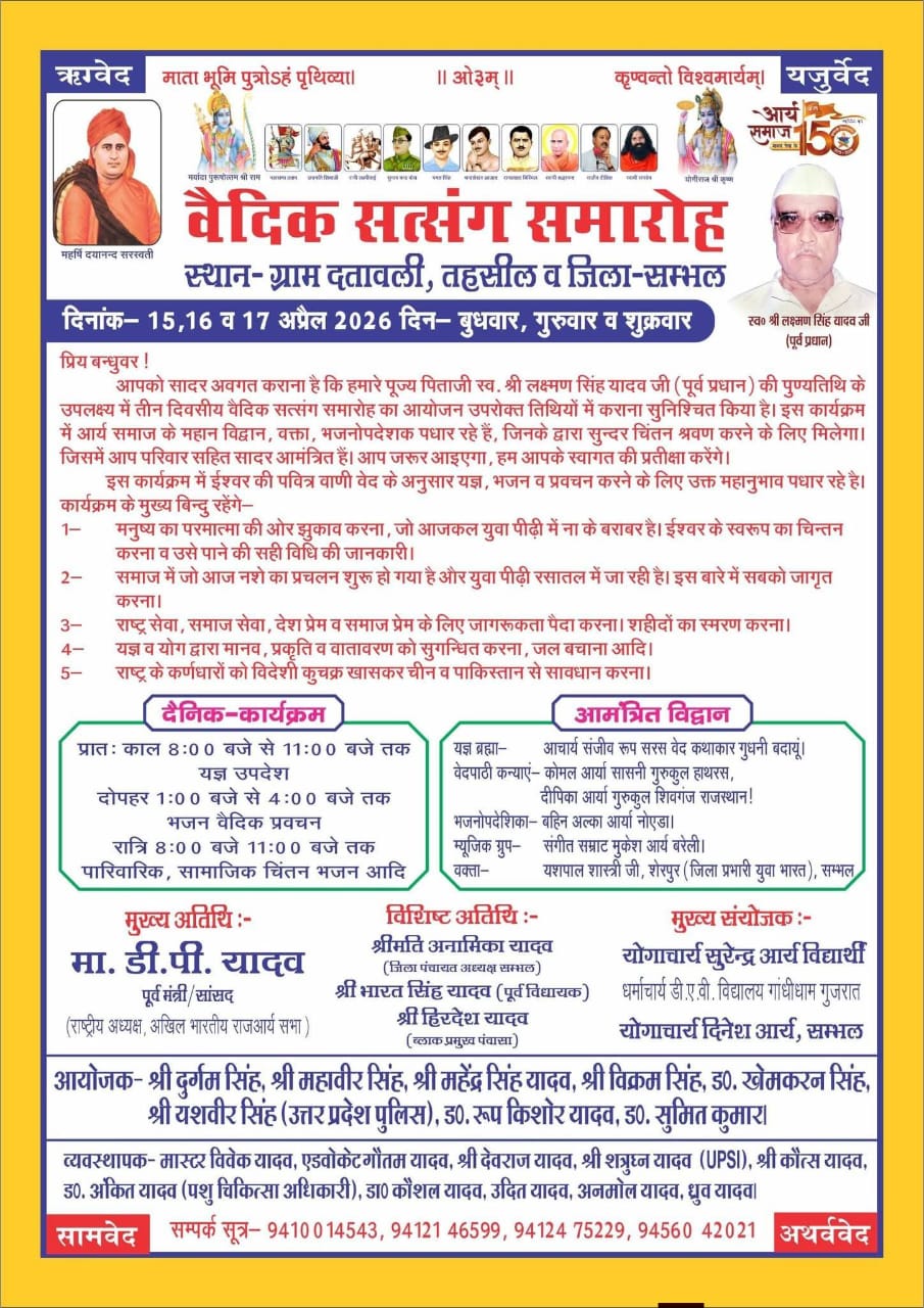 वैदिक धर्म, सामाजिक जागरूकता और राष्ट्रसेवा की भावना को समर्पित एक भव्य वैदिक सत्संग समारोह का आयोजन 15, 16 एवं 17 अप्रैल 2026 को अत्यंत श्रद्धा, भक्ति और उत्साह के साथ किया जा रहा है। यह त्रिदिवसीय समारोह समाज में वैदिक विचारधारा, संस्कारों और नैतिक मूल्यों के प्रचार-प्रसार हेतु एक प्रेरणादायक पहल है।