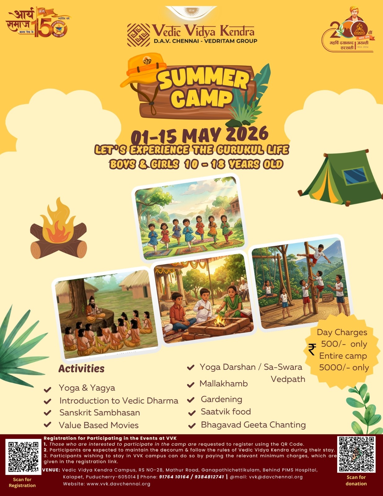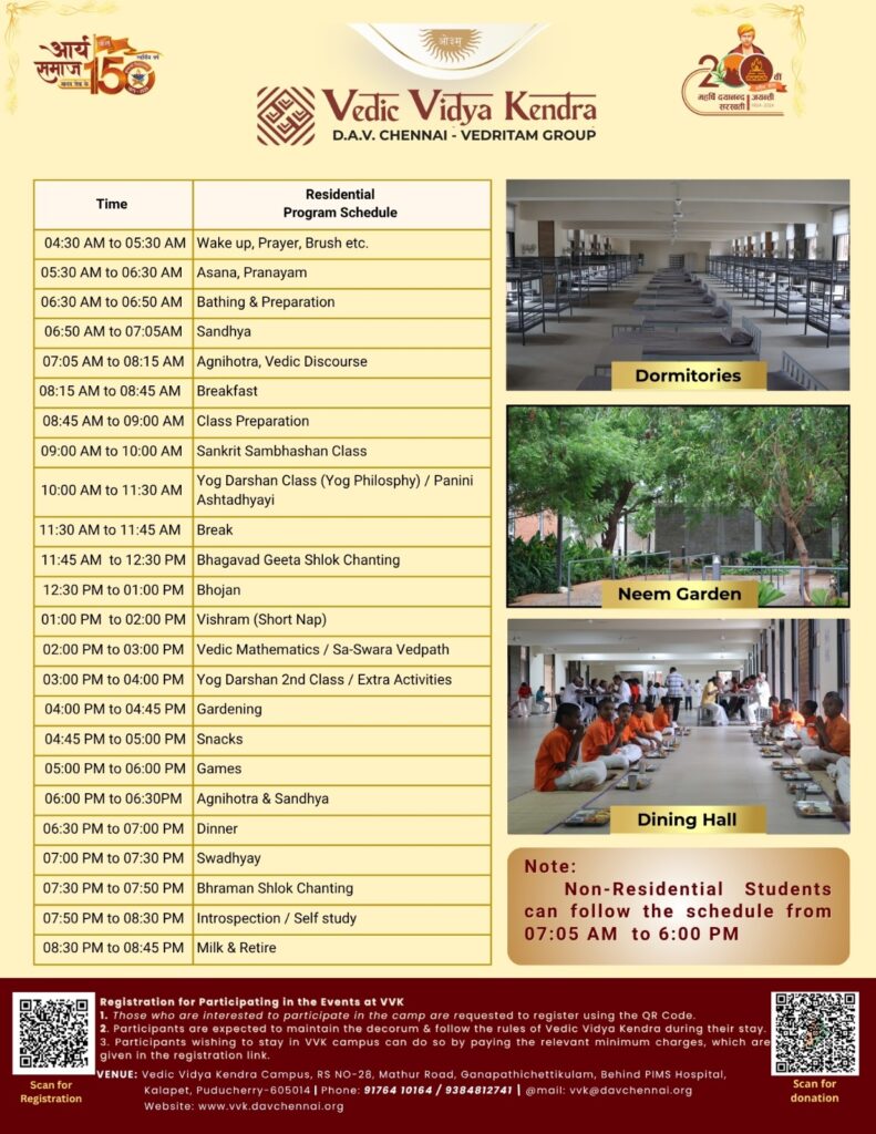 Puducherry sthit Vedic Vidya Kendra (D.A.V. Chennai – Vedritam Group) dwara garmiyon ki chhuttiyon ke avsar par ek vishesh Summer Camp 2026 ka ayojan kiya ja raha hai। Yeh shivir bachchon ke sharirik, mansik, adhyatmik aur sanskarik vikas ko dhyan mein rakhkar tayyar kiya gaya hai। Is camp ka uddeshya bachchon ko Gurukul jeevan ki anushasit aur adarsh jeevan shaili ka anubhav karwana hai।