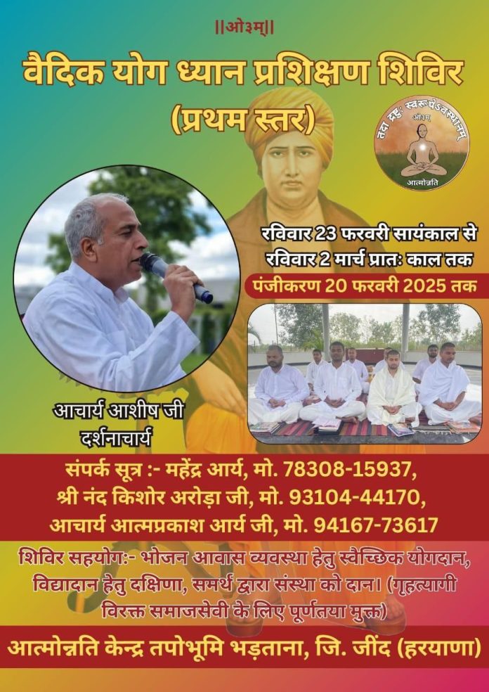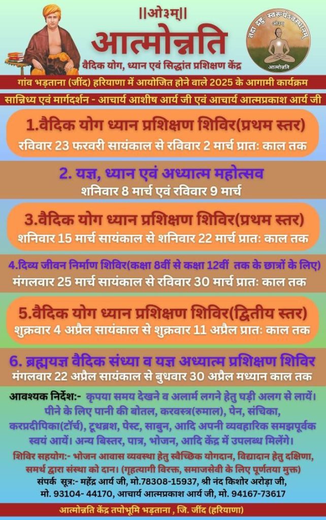 स्थान- आत्मोन्नति (वैदिक योग,ध्यान एवं सिद्धांत प्रशिक्षण केन्द्र),ग्राम-भड़ताना,जिला-जीन्द, हरियाणा- 126113