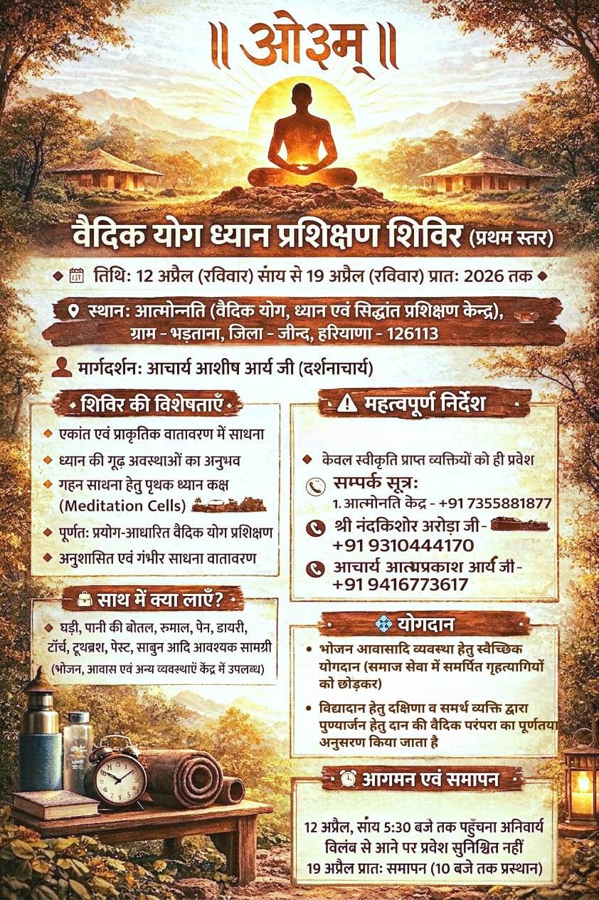 ग्राम भड़ताना, जिला जीन्द, हरियाणा में 12 अप्रैल 2026 (रविवार) सायंकाल से 19 अप्रैल 2026 (रविवार) प्रातः तक वैदिक योग ध्यान प्रशिक्षण शिविर (प्रथम स्तर) का भव्य एवं साधना-प्रधान आयोजन किया जा रहा है। यह शिविर आचार्य आशीष आर्य जी, दर्शनाचार्य के मार्गदर्शन में संपन्न होगा।