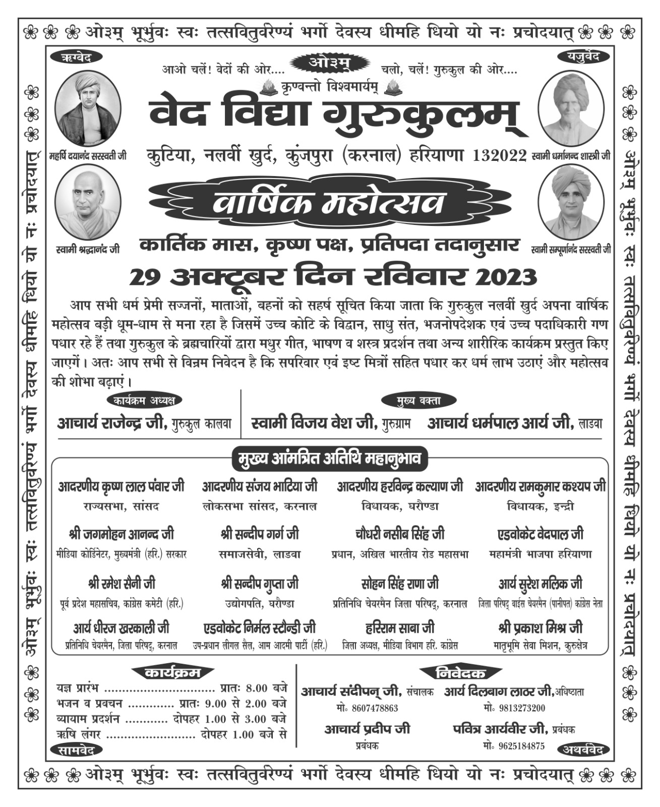 आप सभी धर्म प्रेमी सज्जनों, माताओं, बहनों को सहर्ष सूचित किया जाता कि गुरुकुल नलवीं खुर्द अपना वार्षिक महोत्सव बड़ी धूम-धाम से मना रहा है जिसमें उच्च कोटि के विद्वान, साधु संत, भजनोपदेशक एवं उच्च पदाधिकारी गण पधार रहे हैं तथा गुरुकुल के ब्रह्मचारियों द्वारा मधुर गीत, भाषण व शस्त्र प्रदर्शन तथा अन्य शारीरिक कार्यक्रम प्रस्तुत किए जाएगें। अतः आप सभी से विन्रम निवेदन है कि सपरिवार एवं इष्ट मित्रों सहित पधार कर धर्म लाभ उठाएं और महोत्सव की शोभा बढ़ाएं।
