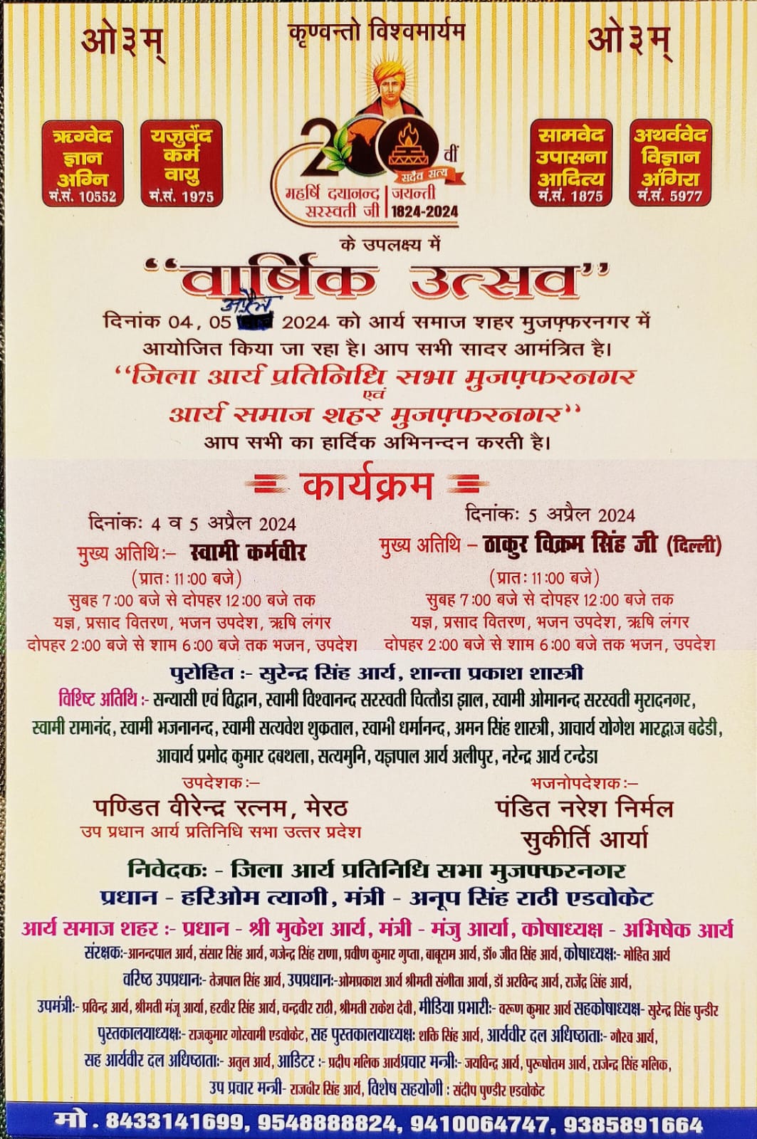 दिनांक 04, 05 अप्रैल 2024 को आर्य समाज शहर मुजफ्फरनगर में आयोजित किया जा रहा है। आप सभी सादर आमंत्रित है। “जिला आर्य प्रतिनिधि सभा मुजफ्फरनगर एवं आर्य समाज शहर मुजफ्फरनगर” आप सभी का हार्दिक अभिनन्दन करती है।