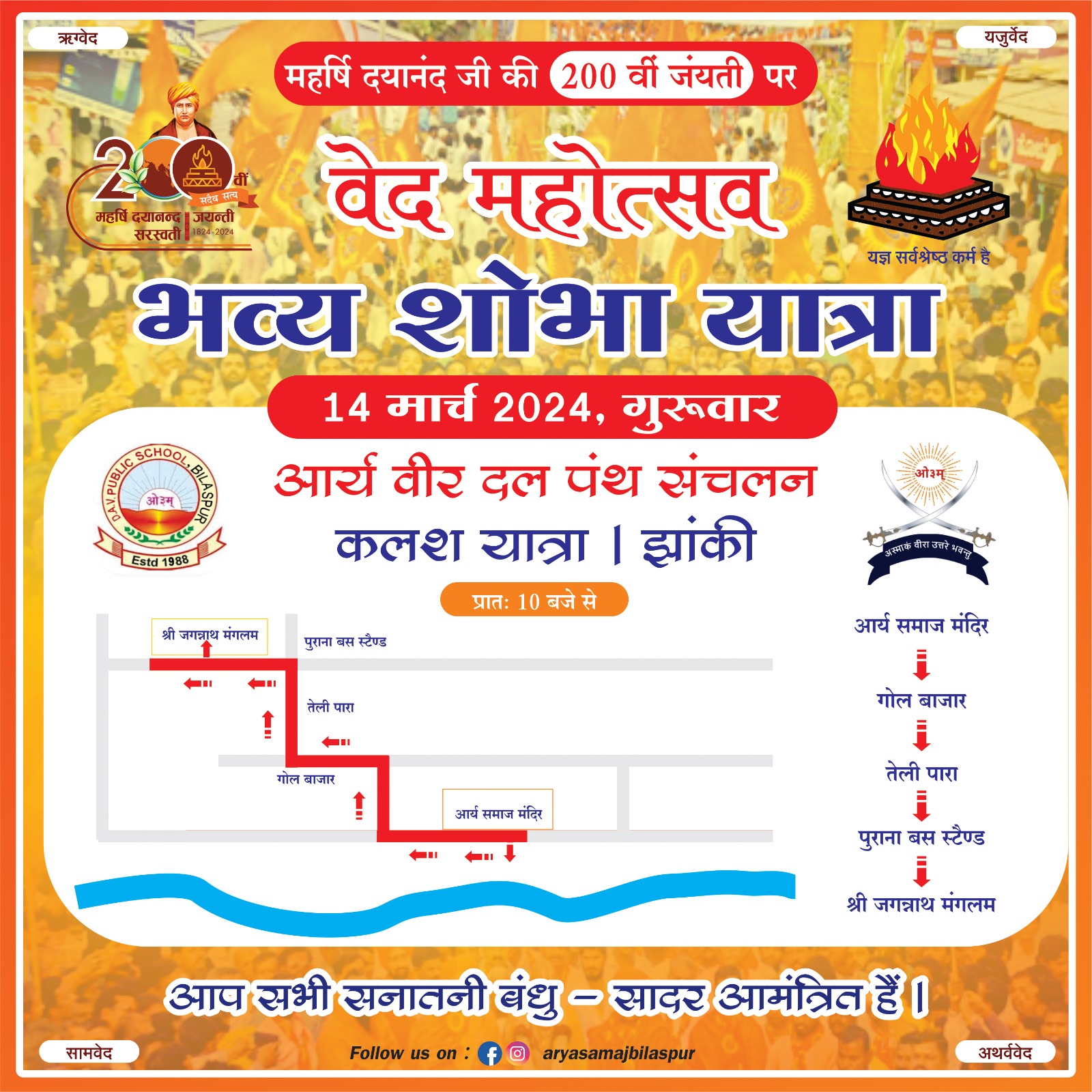 आर्य वीर दल पंथ संचलन कलश यात्रा | झांकी प्रातः 10 बजे से।