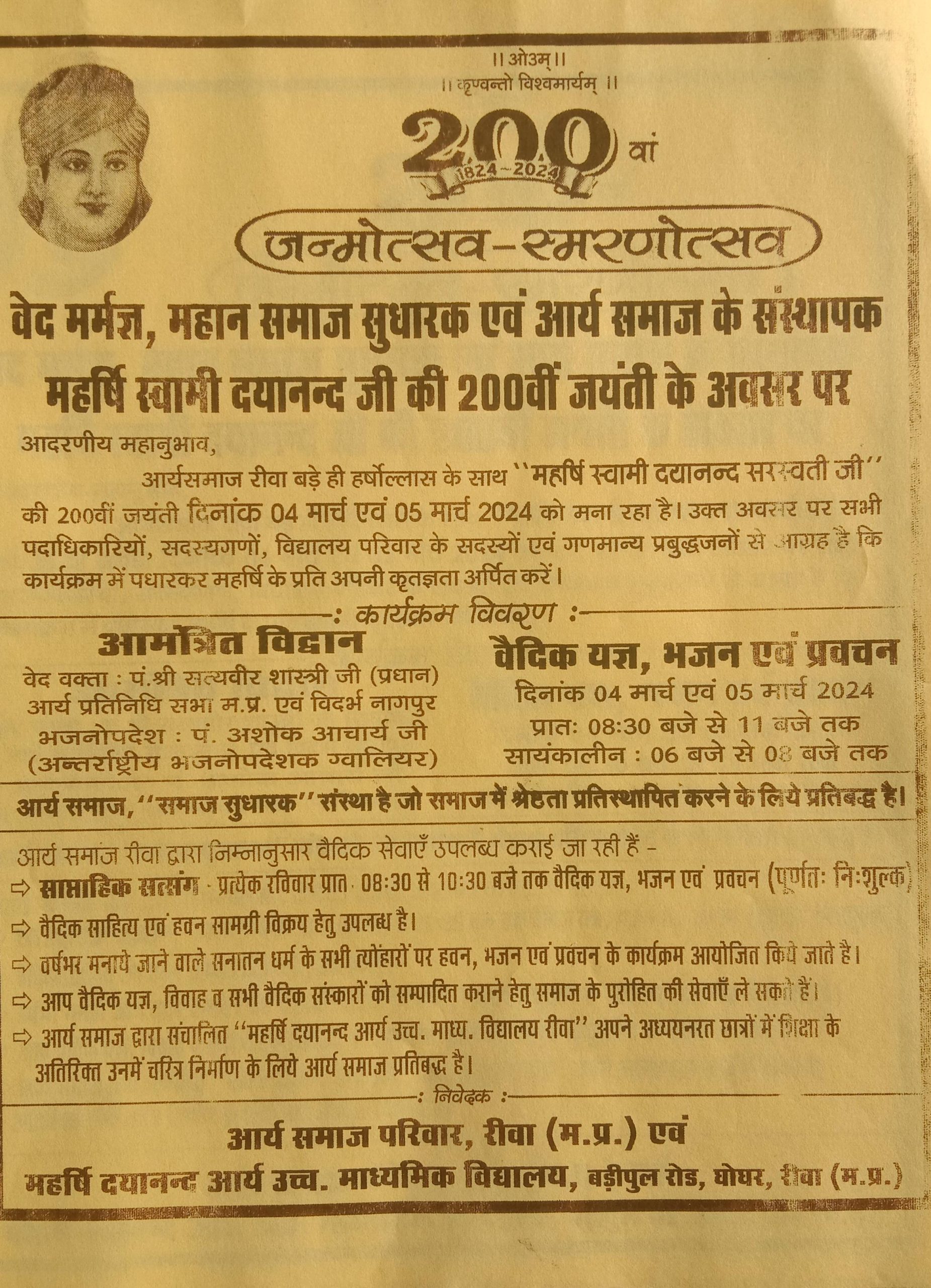 आर्यसमाज रीवा बड़े ही हर्षोल्लास के साथ “महर्षि स्वामी दयानन्द सरस्वती जी” की 200वीं जयंती दिनांक 04 मार्च एवं 05 मार्च 2024 को मना रहा है।
