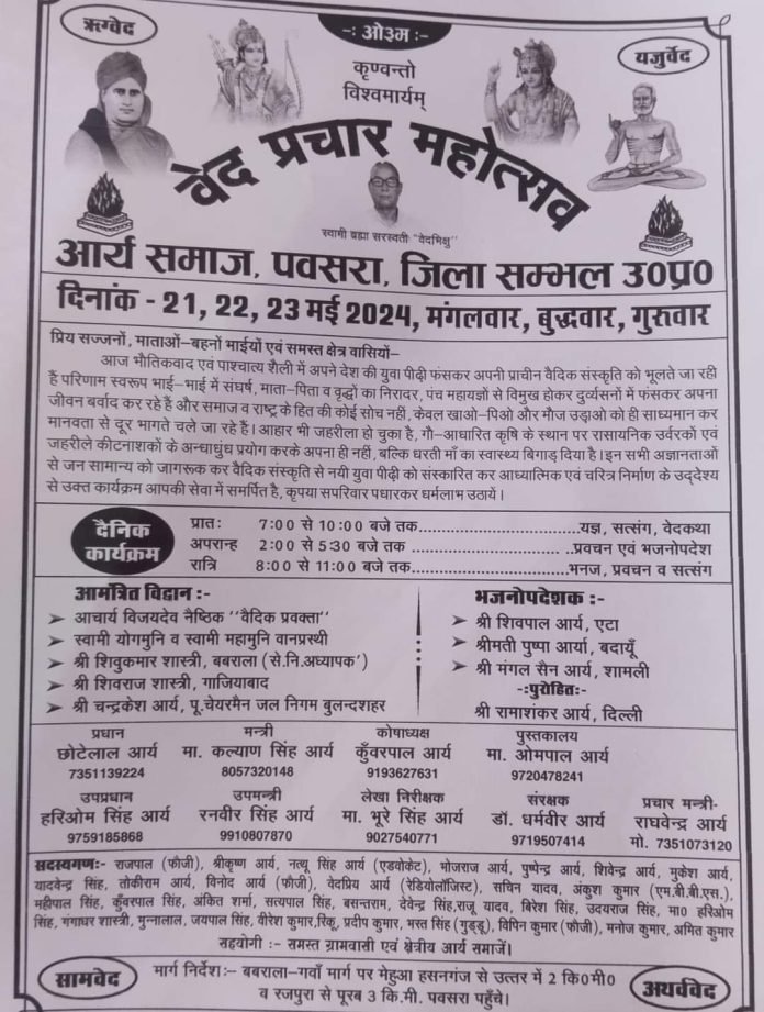 आर्य समाज, पवसरा, जिला सम्भल उ०प्र० दिनांक – 21, 22, 23 मई 2024, मंगलवार, बुद्धवार, गुरुवार