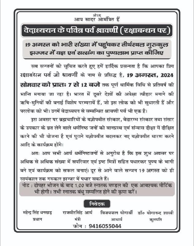 आप सादर आमंत्रित हैं वेदाध्ययन के पवित्र पर्व श्रावणी (रक्षाबन्धन पर)19 अगस्त को भारी संख्या में पहुंचकर तीर्थस्थल गुरुकुल झज्जर में यज्ञ एवं सत्संग का पुण्यलाभ प्राप्त कीजिए