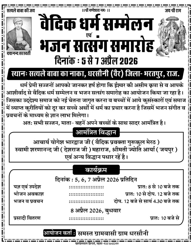 धार्मिक और आध्यात्मिक चेतना को जागृत करने हेतु ग्राम धरसौनी (वैर), जिला भरतपुर, राजस्थान में “वैदिक धर्म सम्मेलन और भजन सत्संग समारोह” का भव्य आयोजन 5 से 7 अप्रैल 2026 तक किया जा रहा है। यह पावन कार्यक्रम सत्यले बाबा का नाका में आयोजित होगा, जहाँ श्रद्धालुजन भक्ति, ज्ञान और संस्कारों का अद्भुत संगम अनुभव करेंगे।
