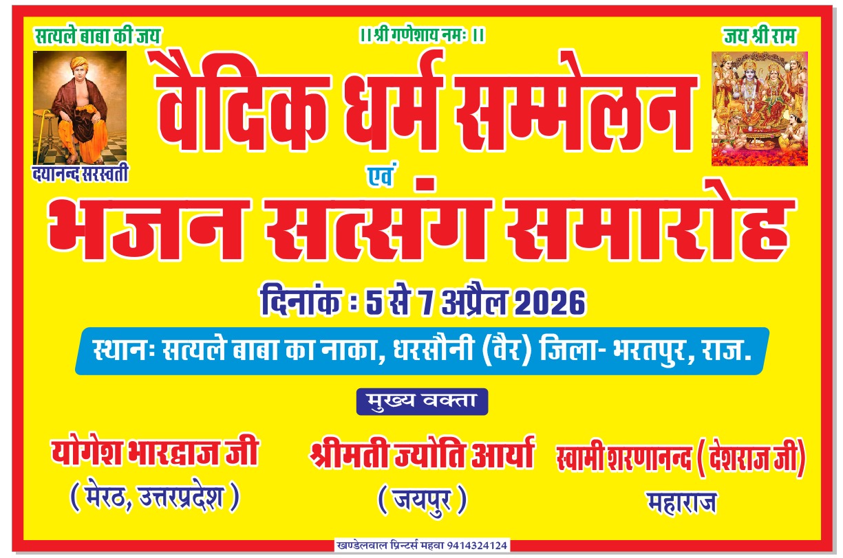 धार्मिक और आध्यात्मिक चेतना को जागृत करने हेतु ग्राम धरसौनी (वैर), जिला भरतपुर, राजस्थान में “वैदिक धर्म सम्मेलन और भजन सत्संग समारोह” का भव्य आयोजन 5 से 7 अप्रैल 2026 तक किया जा रहा है। यह पावन कार्यक्रम सत्यले बाबा का नाका में आयोजित होगा, जहाँ श्रद्धालुजन भक्ति, ज्ञान और संस्कारों का अद्भुत संगम अनुभव करेंगे।
