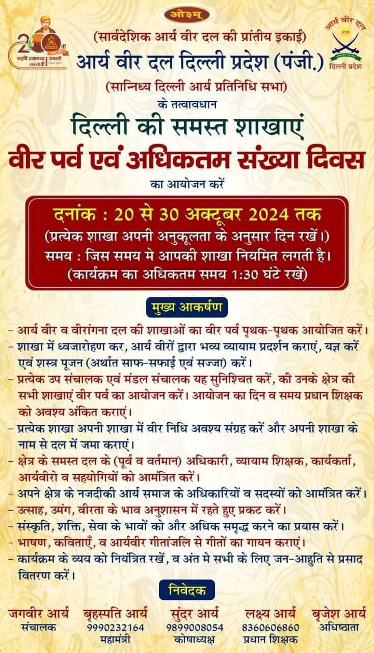 सार्वदेशिक आर्य वीर दल की प्रांतीय इकाई) आर्य वीर दल दिल्ली प्रदेश (पंजी.) (सान्निध्य दिल्ली आर्य प्रतिनिधि सभा) के तत्वावधान