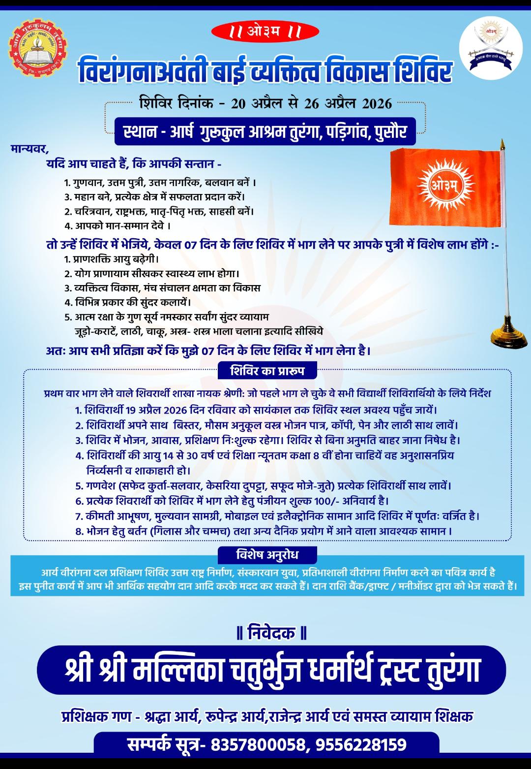 - शिविरार्थी 19 अप्रैल 2026 दिन रविवार को सायंकाल तक शिविर स्थल अवश्य पहुँच जायें।