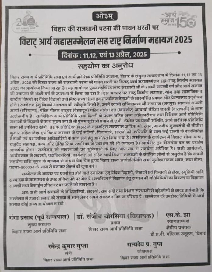 बिहार राज्य आर्य प्रतिनिधि सभा एवं आर्य प्रादेशिक प्रतिनिधि उपसभा, विहार के संयुक्त तत्वावधान में दिनांक 11,12 एवं 13 अप्रैल, 2025 को बिहार राज्य की राजधानी पटना की पावन धरती पर विराट् आर्य महासम्मेलन सह-राष्ट्र निर्माण महायज्ञ 2025 का आयोजन किया जा रहा है। यह आयोजन पूज्य महर्षि दयानन्द सरस्वती जी के 200यी जयन्ती वर्ष और आर्य समाज की स्थापना के 150वें वर्ष के उपलक्ष्य में किया जा रहा है। इस अवसर पर राष्ट्र निर्माण महायज्ञ, योग तथा सामाजिक व राष्ट्रीय विषयों पर वैदिक विद्वानों तपो निष्ठ संन्यासियों एवं सामाजिक नेताओं के सारगर्भित प्रवचन और प्रेरणास्पद उद्द्योधन होंगे। सम्मेलन हेतु जिनके आगमन की स्वीकृति मिली है, उनमें स्वामी सच्चिदानन्द जी महाराज (जयपुर) आचार्या अंजली आर्या (हरियाणा), पंडित गौतम डाट्टर (देहरादून) पंडित योगेश दत्त (बिजनौर) आचार्या नंदिता शास्त्री (वाराणसी) के नाम उल्लेखनीय है। सार्वदेशिक आर्य प्रतिनिधि सभा दिल्ली के प्रधान सहित अन्य अधिकारीगण तथा विभिन्न आर्य प्रतिनिधि सभाओं के विद्वानों के साथ मुख्य रूप से श्री पुनम सूरी जी प्रचान डी.ए.वी. कॉलेज प्रबंधकत्री समिति, आर्य प्रादेशिक प्रतिनिधि सभा भी उपस्थित रहेंगे। इसके अतिरिक्त विहार के महामहिम राज्यपाल आरिफ मो. खान, माननीय मुख्यमंत्री श्री नीतीश कुमार सहित केन्द्र एवं बिहार सरकार के कई मंत्रियो, विधायकों, सांसदों की उपस्थिति के साथ कई राज्यों के राजनितिज्ञ नेताओं एवं प्रशासनिक अधिकारियों के भाग लेने हेतु आंमत्रित किया गया है। सम्मेलन के कार्यक्रम में विशाल शोभा यात्रा, यजुर्वेद महायज्ञ, भव्य और ऐतिहासिक स्मारिका के प्रकाशन की भी व्यवस्था है। आर्यवीर एवं वीरागंना दल का प्रदर्शन आकर्षक होगा। सम्मेलन की व्यवस्थाओं एवं सुविधाओं के लिए आप सब से सहयोग अपेक्षित है। सभी आर्यजजों, आर्यसमाज के सदस्यों, पदाधिकारियों, कार्यकर्ताओ सहित आर्य शिक्षण संस्थाओं के संबंधित लोगों से अनुरोध है कि अपनी सहयोग राशि कूपन के माध्यम से अथवा चेक बैंक ड्राफ्ट बिहार राज्य आर्यप्रतिनिधि सभा मुनीश्वरानन्द भवन, नया टोला, पटना-800004 के नाम से बनाकर भेजने की कृपा करे।