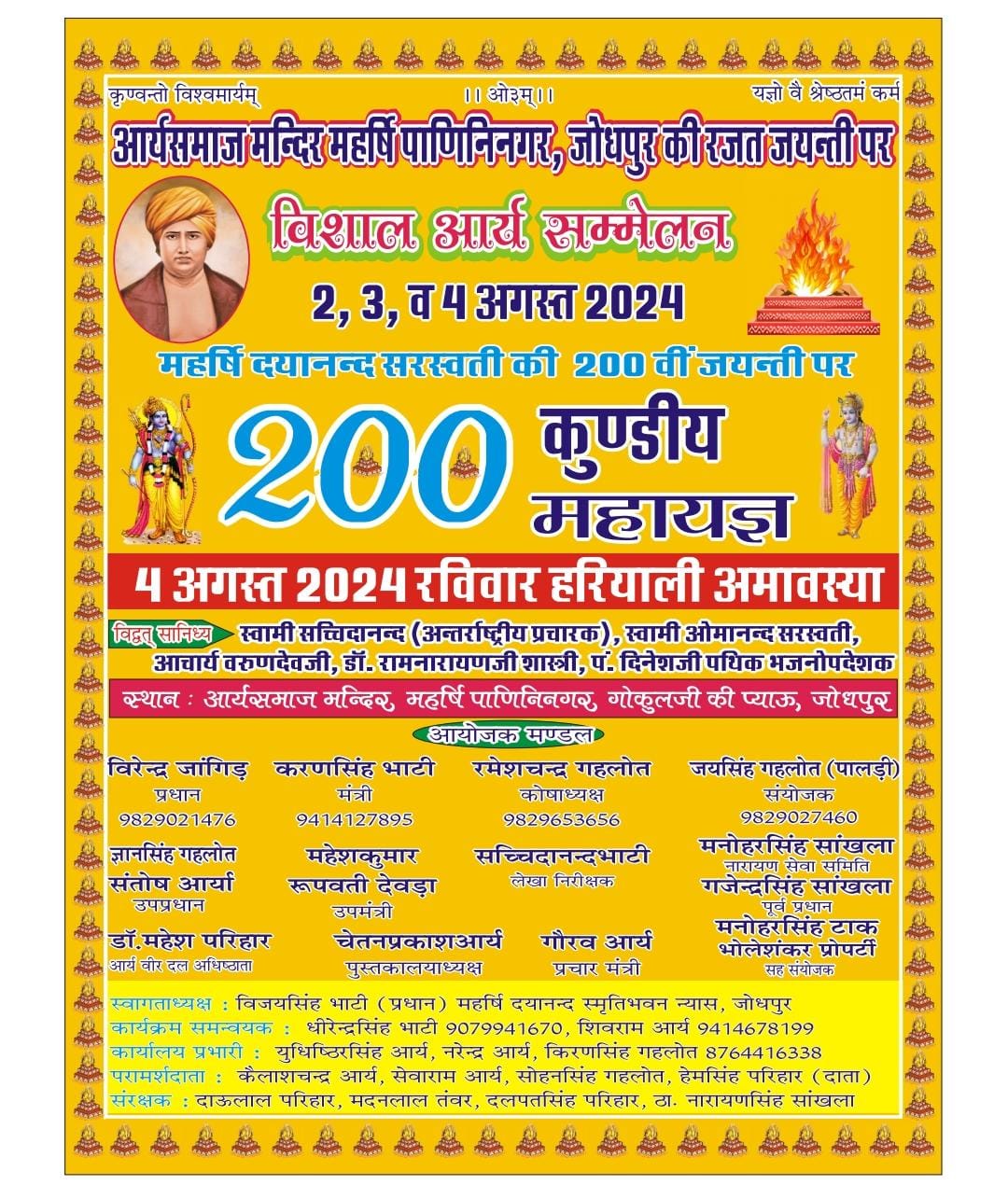 मर्यादा पुरुषोत्तम श्रीराम व योगीराज श्रीकृष्ण की सनातन परम्परा के संवाहक, युगप्रवर्त्तक महर्षि दयानन्द सरस्वती की 200 वीं जयन्ती व आर्यसमाज मन्दिर, महर्षि पाणिनिनगर की रजत जयन्ती पर विशाल आर्य सम्मेलन व 200 कुण्डीय महायज्ञ में सपरिवार पधारकर तन, मन व धन से सहयोग देकर पुण्य के भागी बनें।
