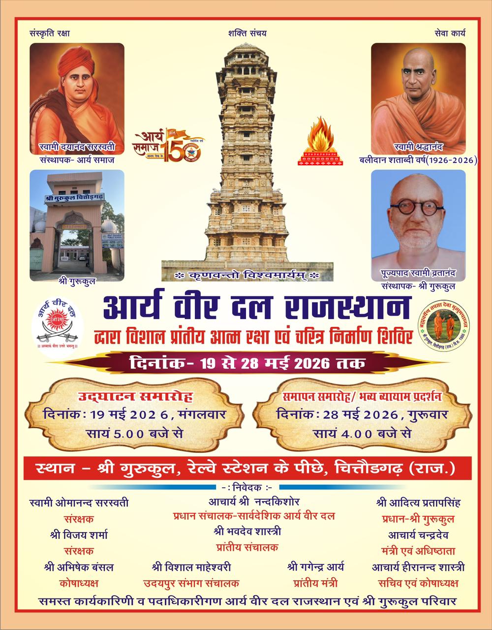 अत्यन्त हर्ष के साथ सूचित किया जाता है कि बप्पा रावल, राणा कुम्भा, राणा सांगा, महाराणा प्रताप, राणा रतनसिंह, महारानी पद्मिनी, मीराबाई, पन्नाधाय, भामाशाह, शक्ति, भक्ति, त्याग की बलिदानी भूमि चित्तौड़गढ में स्वामी श्रद्धानन्द जी के बलीदान शताब्दी वर्ष के उपलक्ष में उन्ही से प्रेरीत पूज्यपाद स्वामी व्रतानंदजी द्वारा प्राकृतिक एवं आध्यात्मिक वातावरण में स्थापित श्री गुरूकुल एवं आर्य वीर दल राजस्थान के संयुक्त तत्वावधान में बालकों के सर्वांगीण विकास हेतु दि. 19/05/2026 से 28/05/2026 तक 10 दिवसीय पूर्ण आवासीय शिविर का आयोजन होगा।