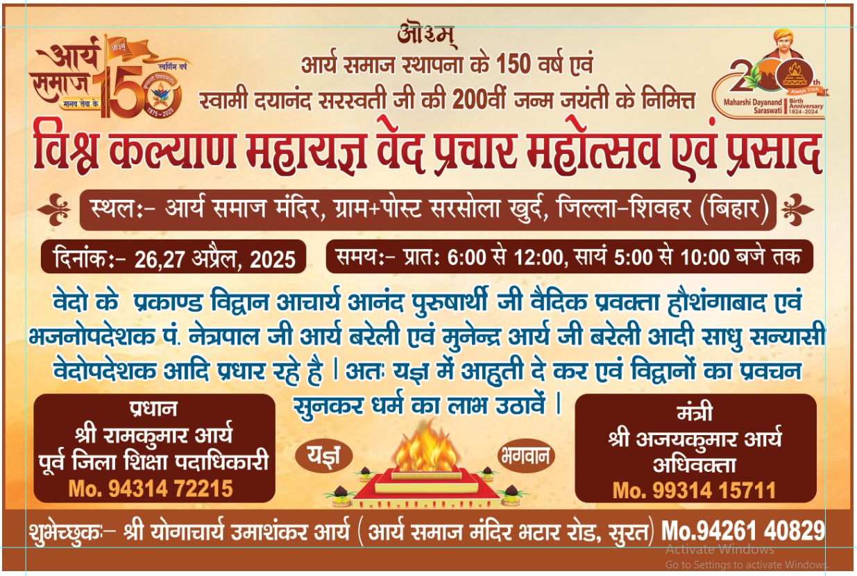 आर्य समाज की स्थापना के 150 गौरवशाली वर्ष एवं महर्षि स्वामी दयानंद सरस्वती जी की 200वीं जन्म जयंती के पावन अवसर पर आर्य समाज मंदिर, ग्राम सरसोला खुर्द, जिला शिवहर (बिहार) में एक भव्य विश्व कल्याण महायज्ञ, वेद प्रचार महोत्सव एवं प्रसाद वितरण का आयोजन किया जा रहा है।