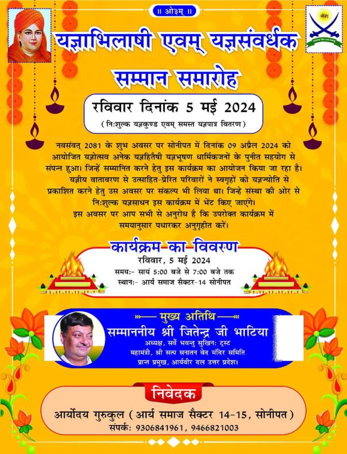 नवसंवत् 2081 के शुभ अवसर पर सोनीपत में दिनांक 09 अप्रैल 2024 को आयोजित यज्ञोत्सव अनेक यज्ञहितैषी यज्ञभूषण धार्मिकजनों के पुनीत सहयोग से संपन्न हुआ। जिन्हें सम्मानित करने हेतु इस कार्यक्रम का आयोजन किया जा रहा है। यज्ञीय वातावरण से उत्साहित प्रेरित परिवारों ने स्वगृहों को यज्ञज्योति से प्रकाशित करने हेतु उस अवसर पर संकल्प भी लिया था। जिन्हे संस्था की ओर से निःशुल्क यज्ञसाधन इस कार्यक्रम में भेंट किए जाएंगे। इस अवसर पर आप सभी से अनुरोध है कि उपरोक्त कार्यक्रम में समयानुसार पधारकर अनुगृहीत करें।