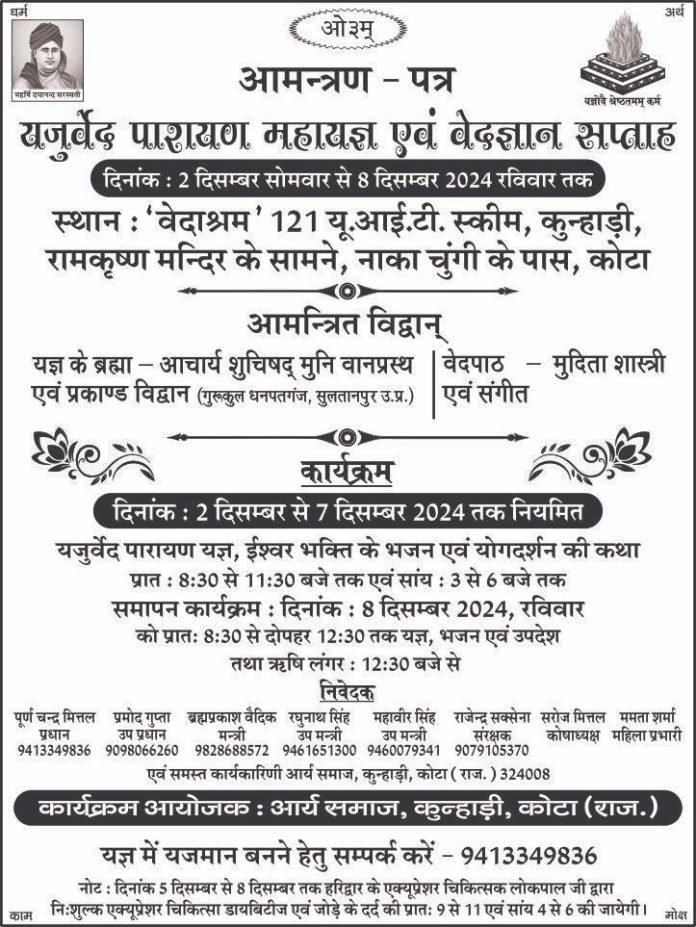 कार्यक्रम आयोजक : आर्य समाज, कुन्हाड़ी, कोटा (राज.)