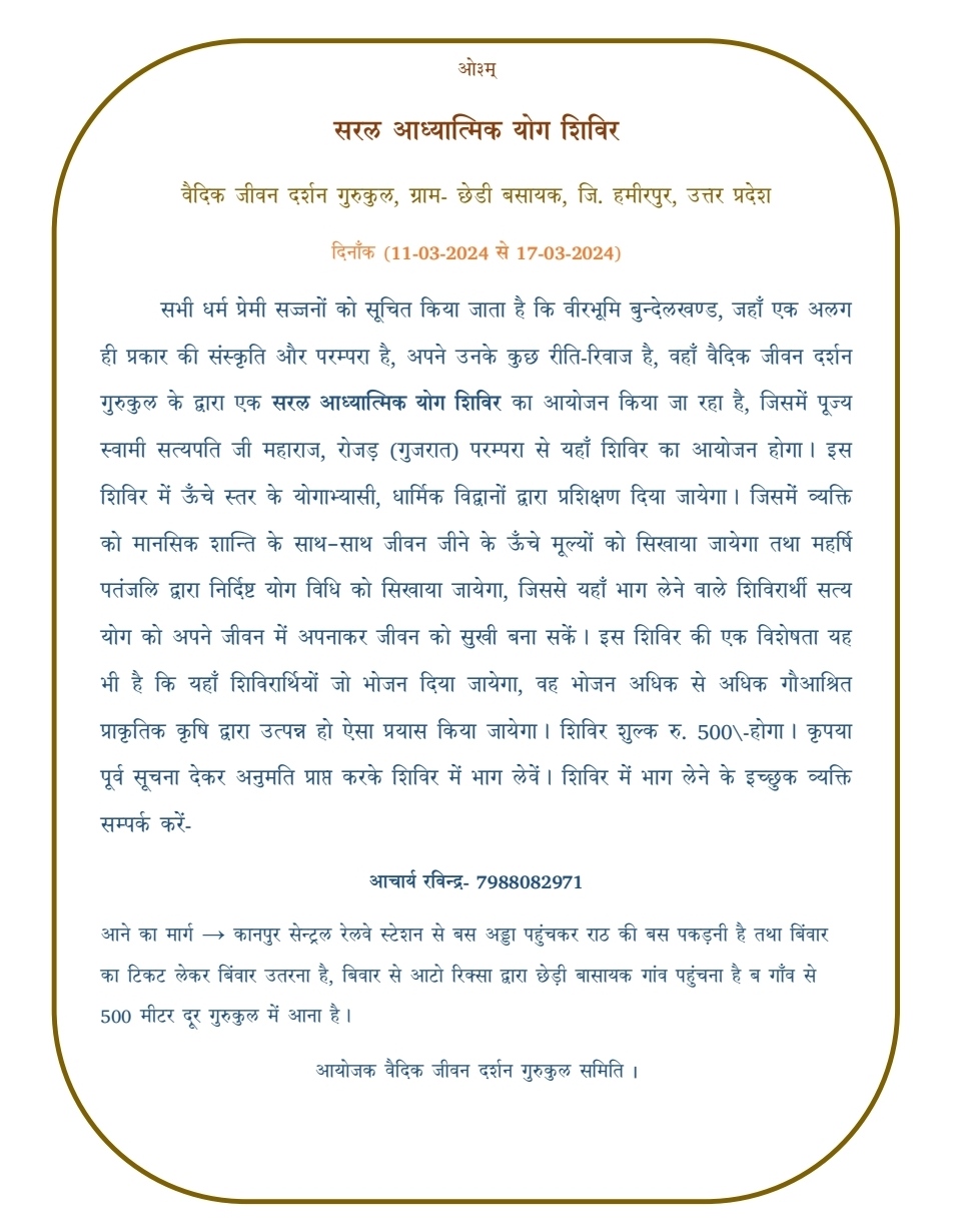 सभी धर्म प्रेमी सज्जनों को सूचित किया जाता है कि वीरभूमि बुन्देलखण्ड, जहाँ एक अलग ही प्रकार की संस्कृति और परम्परा है, अपने उनके कुछ रीति-रिवाज है, वहाँ वैदिक जीवन दर्शन गुरुकुल के द्वारा एक सरल आध्यात्मिक योग शिविर का आयोजन किया जा रहा है, जिसमें पूज्य स्वामी सत्यपति जी महाराज, रोजड़ (गुजरात) परम्परा से यहाँ शिविर का आयोजन होगा।