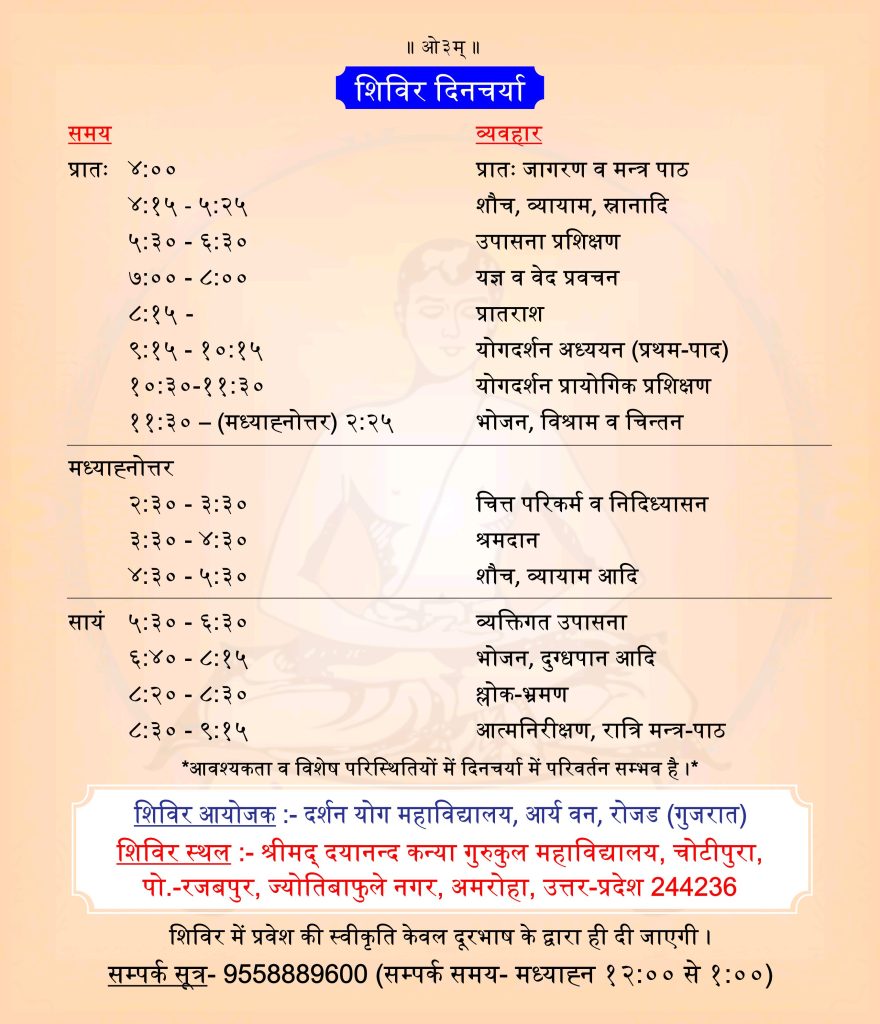 - ०७:०० – ०८:०० – यज्ञ व वेद प्रवचन