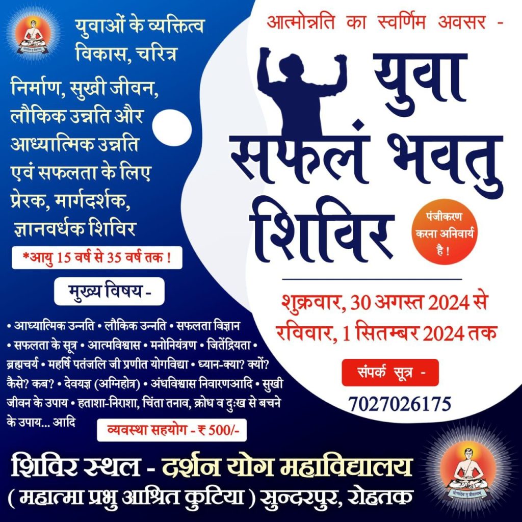 युवाओं के व्यक्तित्व विकास, चरित्र निर्माण, सुखी जीवन, लौकिक उन्नति, आध्यात्मिक उन्नति एवं सफलता के लिए प्रेरक, मार्गदर्शक, ज्ञानवर्धक शिविर
